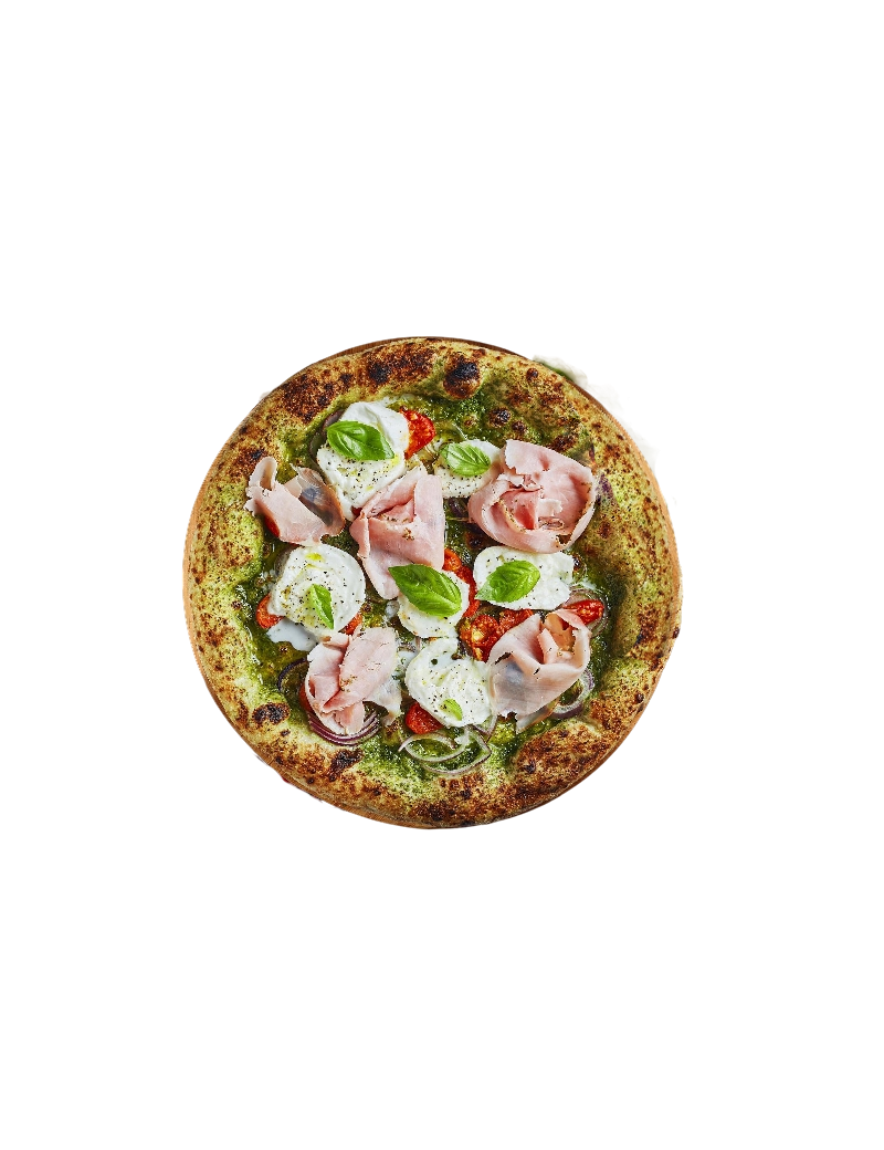Base pesto, mozzarella, jambon de dinde, tomates cerises, oignons, mozzarella di bufala, origan, huile d'olive extra vierge.